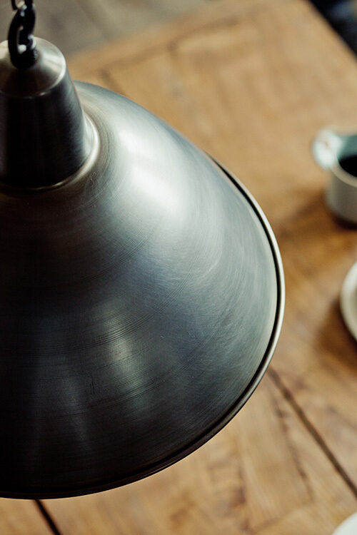 存在感のある大きめの鉄製ペンダント。brownとsilverの2色。brownはサンドブラスト加工後に錆び加工を施しました。silverは鉄そのものの質感を残す加工です。どちらも手作業による仕上げのため自然なムラがあります。下方向のみを照らし空間に陰影が生まれます。100wまで使用可能。LED電球対応。